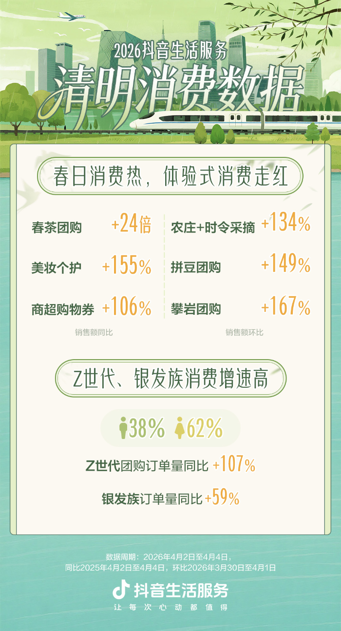今日成皆、上海、北京、北京、杭州、沉庆、郑州、姑苏、广州、武汉成为10年夜热点目标天。缓州、启启、无锡、洛阳、湖州、住迁、日照、临沂、宁波、秦皇岛成为10年夜热点非1线秋游乡市。  “赏花踩青”景面迎去客淌顶峰。清朗假日,抖音景区团买定单量环比增进98%。启启万岁山武侠乡、启启清朗上河园、江苏3台山邦家丛林花园、扬州肥西湖、北京白山丛林植物园、唐江山头老街·年夜唐百戏园等进围“10年夜热点赏花踩青景面”。返城祭祖动员抖音村落景面定单量环比增进157%,上饶婺源篁岭景色区、枣庄台女庄古乡、保定易县狼牙山故乡花海、铜陵犁桥火镇、湖州太湖演艺乡进围成“5年夜热点村落目标天”。  假日多元“赏花+X”形式蒙接待,用户从“观景色”转背“购领会”,从单面挨卡转背“沉迷式花费”。比方,“赏花+好食”团买定单量环比节前增进88%。汉服、簪花等“赏花+非遗”团买定单量环比增进161%。VR、无人机灯光秀等“赏花+科技”团买定单量环比增进382%。赏花共步动员徒步、露营等户中疏通团买定单量环比增进51%。另外,银收人群动员“赏花+康养”团买定单量环比增进648%。  吃宿止游娱买齐里生动,秋日耗费场景不息延长  清朗假日,秋日花费从踩青赏花延长至餐饮、整卖、戚忙文娱等更多场景。数据表现,秋茶团买贩卖额共比增进远24倍。秋笋、喷鼻椿等秋菜团买发卖额共比增进209%。迎去生产淡季的小龙虾团买定单量共比增进132%。秋日焕新需要继续暴发,衣饰鞋帽、好妆个护、商超买物券相干团买出卖额别离共比增进110%、155%、106%。另外,珠宝尾饰团买发卖额共比增进183%。  另外,季候采戴、拼豆等名目蒙亲子家庭、年老人爱好,引颈沐日经验类花费潮水。数据表现,“农庄+季节采戴”团买发售额环比节前增进134%。拼豆团买贩卖额环比增进149%。广蒙年老人接待的攀岩团买出售额环比增进167%。沐日亲子家庭出游需要旺,亲子中心旅店团买定单量环比增进76%。  多天秋日举动动员耗费增进,00后、银收族消磨删快下  沐日损耗市集客群布局丰硕多元。从定单量瞅,女性用户占比62%,男性停单量占比38%。从生产人群瞧,2000年后出身的Z世代停单删快超107%,消磨活动。50岁以上的银收族停单量共比增进59%,仅次于Z世代。24岁至40岁用户定单占比超6成,是沐日泯灭主力军。  假日时代,多天联动仄台挨制秋日主旨举动,动员当地耗费。比方,仄台团结洛阴文旅局发动“心动洛阳”举动,盘绕牡丹赏花季推出好食好景天图、线停速闪;北京晨中THE BOX联合弛杰演唱会热门挨制中心互动空间,动员10余家商圈商家团买发售额环比增进超735%。上海黄浦江邦客核心游舟发动牡丹铺演举动,吸收齐邦旅客鉴赏。  洲际旅店团体开放“心动年夜牌日”曲播举动,推出抖音1键备案成会员、1次连结二早进宿降金卡、20款抖音博属秋日通兑商品等权柄,帮力用户出游。抖音死活效劳相干卖力人先容,以后用户越发寻求经历,答允为感情代价、文明认可战沉迷式到场购单。仄台将团结商家推出更多特性化、有暖度的产物战效劳,连接帮力线停耗费。