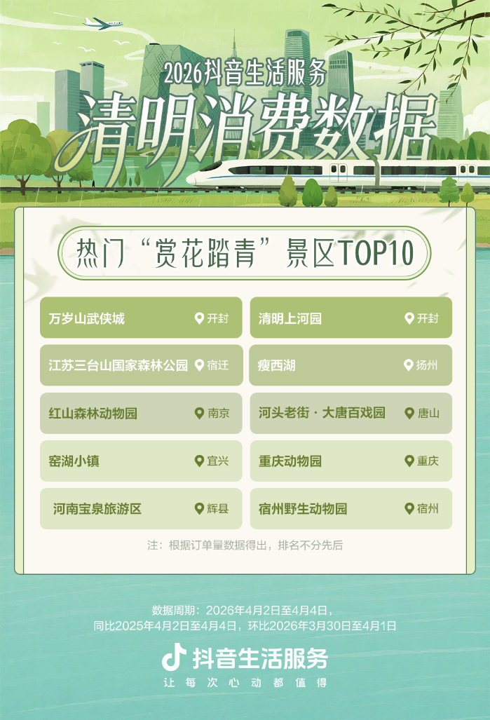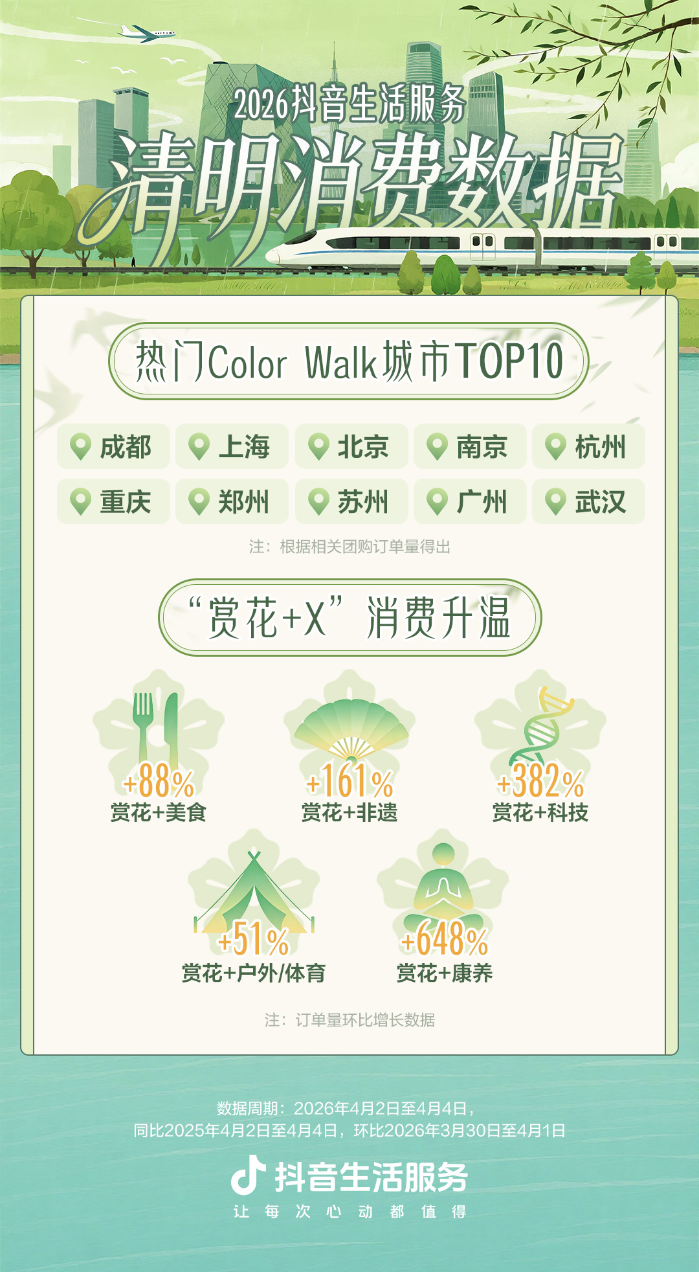 抖音生活服务:清明假期“赏花+”消费升温,相关团购订单量环比节前增长超88%